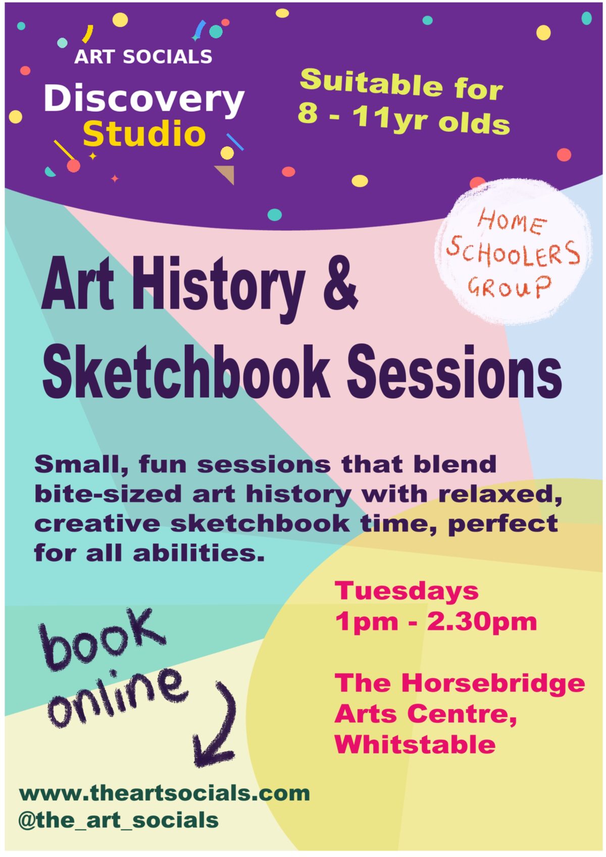 Art Socials’ Discovery Studio is a hands-on Art History & sketchbook session that blends bite-sized art history with relaxed, creative sketchbook time, perfect for all abilities. Each session explores key artists, themes, and techniques in an accessible, engaging way, whilst the guided sketchbook exercises allow the child to experiment, reflect, and develop their own ideas. This session offers a supportive space to learn, try new approaches, and grow creativity. Suitable for children aged 8 – 11yrs.