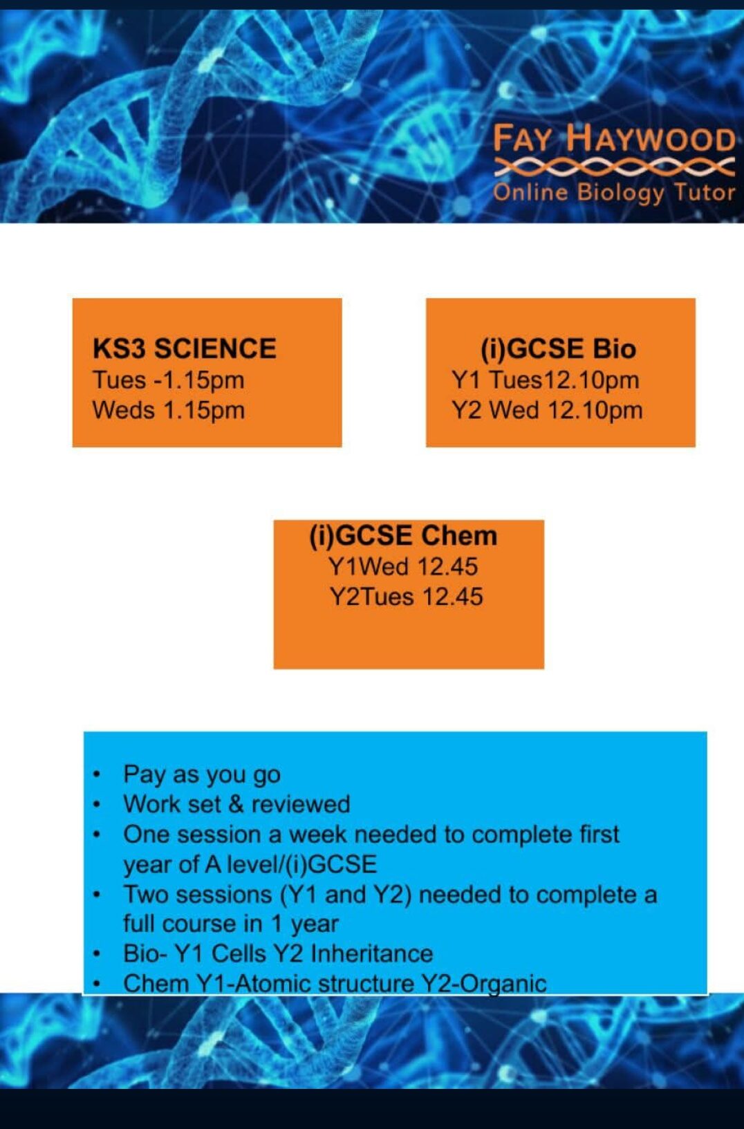 Online low cost Science lessons on a Tues and Weds perfect for home education. Clear explanations and work is set to complete after the lesson to consolidate understanding. Lessons follow on from each other so that a course is completely taught. I’m an upbeat and very experienced teacher.